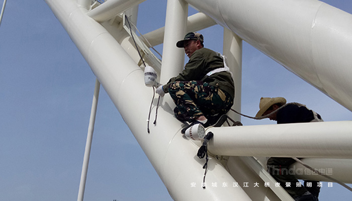 在安康的城東漢江大橋中,橋梁的照明工程施工已經(jīng)進行到高空作業(yè)部分,現(xiàn)在現(xiàn)場在用吊車配合作業(yè)進行LED燈具的安裝工作。