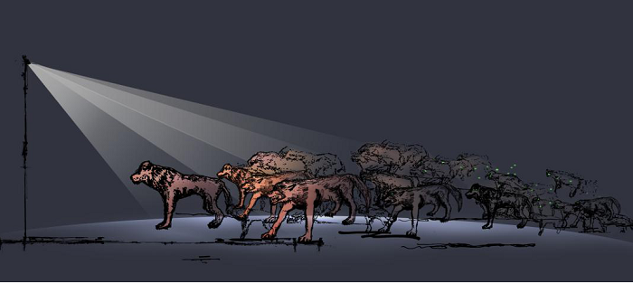 《狼來(lái)了》百匹狼群,以重點(diǎn)照明的方式著重刻畫頭狼及狼群的氣勢(shì)。狼群的后部,在狼眼處涂抹熒光粉,配合黑光燈,使狼眼在黑暗處散發(fā)出寒光。從整體上感覺(jué)狼群漸漸從黑暗中走出,給人一種狼來(lái)了的動(dòng)態(tài)氣勢(shì)。