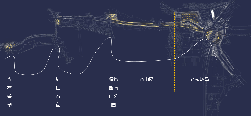 規(guī)劃設(shè)計(jì)中,信達(dá)設(shè)計(jì)師以香山環(huán)島、植物園南門入口公園、紅山香茵、香林疊翠為主要節(jié)點(diǎn),并與行道樹形成明暗相間、峰谷韻生的亮度節(jié)奏,呼應(yīng)香山山水環(huán)繞的自然格局。