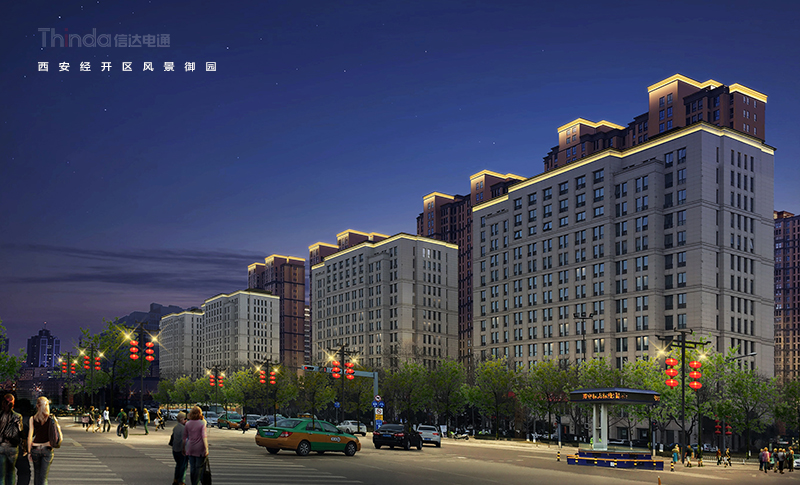 風景御園位于西安市經開區鳳城八路,在市政府對面,本項為商業辦公樓夜景照明設計,建筑的立面材質為淺色石材為主。四棟建筑的建筑形態相同,沿縱向結構游走,整體造型簡潔、大氣,本項屬于高層建筑。