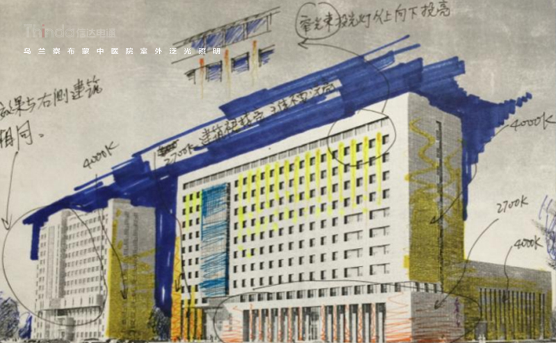 烏蘭察布蒙中醫(yī)院是由政府投資建設(shè)的以突出蒙中醫(yī)特色為重點(diǎn)的綜合性醫(yī)院,位于烏蘭察布市集寧新區(qū)工農(nóng)大街西呼格吉街南,蒙中醫(yī)院的室外泛光照明一方面需要考慮其功能性,同時(shí)在其建筑類型和定位上也要有所不同。